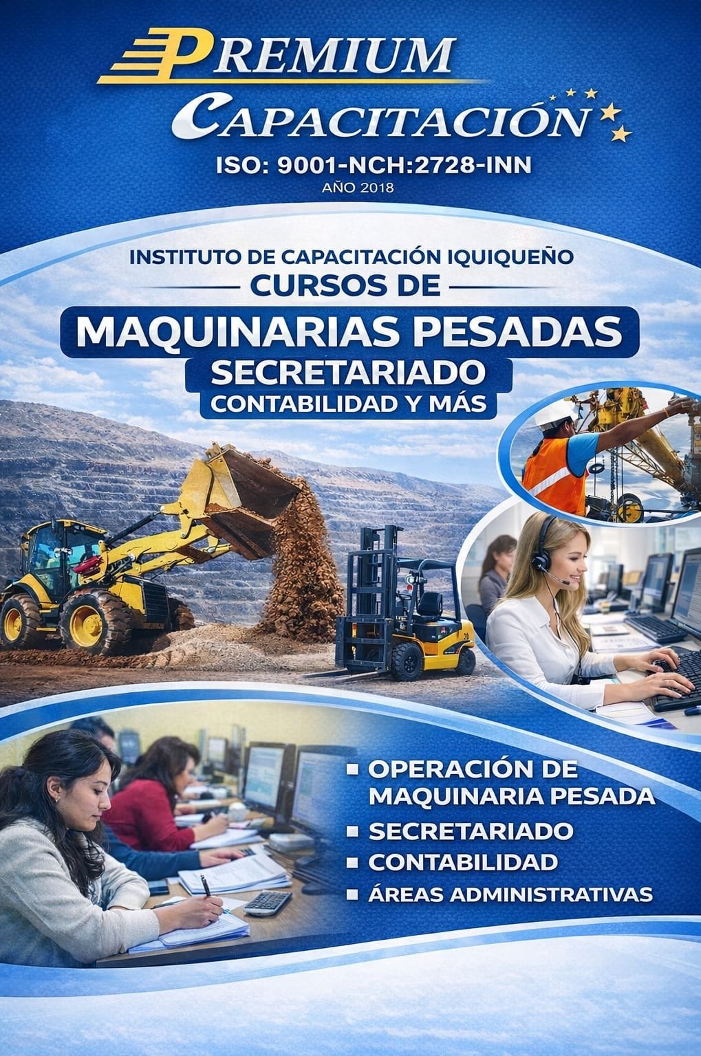 Cuenta con una amplia oferta de cursos en operación de maquinaria pesada, secretariado, contabilidad y áreas administrativas, combinando contenidos teóricos con enfoque práctico, dictados por relatores con experiencia en cada especialidad.